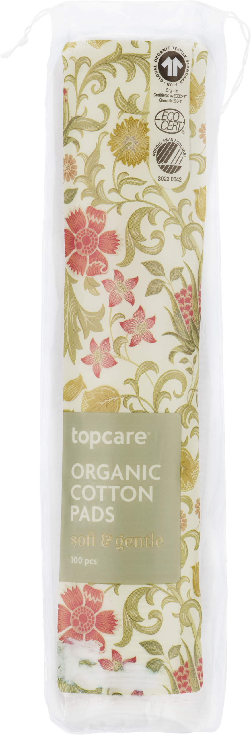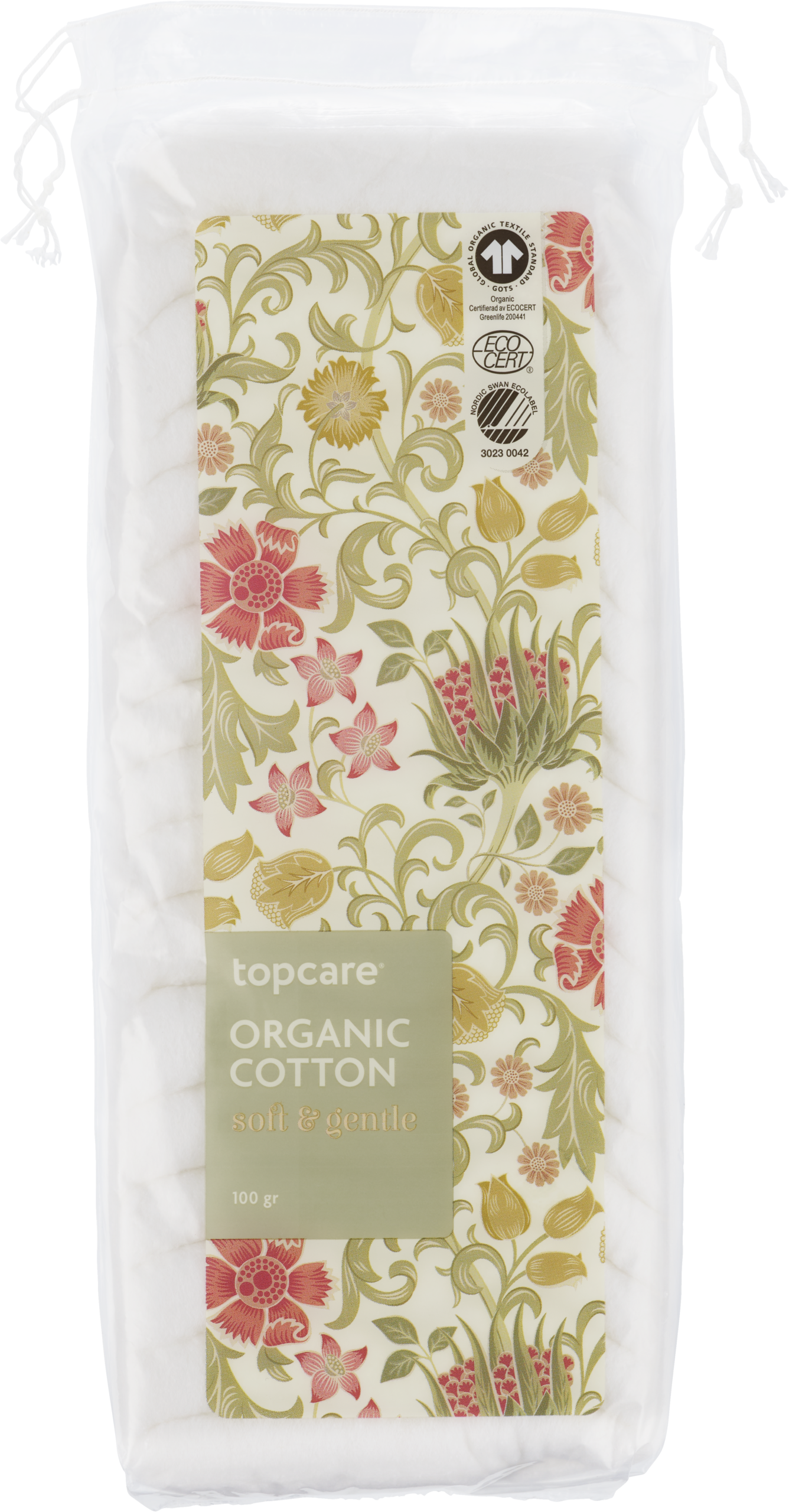 100% ekologiskt bomull, ej klorblekt och utan optiska vitmedel. Används för rengöring och sminkborttagning. Använd inte bomullen vid sårrengöring eller som förband på skadad hud. Förpackningen består av 85% återvunnen plast. 100 gr