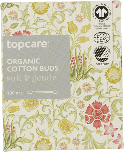 100% ekologiskt bomull, ej klorblekt, utan optiska vitmedel och pinnar av FSC – certifierat papper. Bomullspinnar för rengöring och skönhetsvård. Använd endast bomullspinnar för rengöring av örats yttre delar. 200 pcs