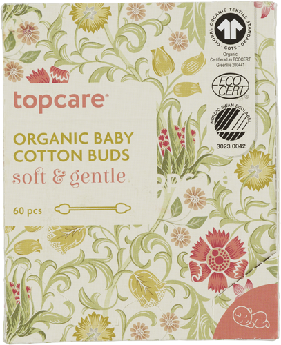 100% ekologiskt bomull, ej klorblekt, utan optiska vitmedel och pinnar av FSC – certifierat papper. Babybomullspinnar för rengöring och babyvård. Använd endast bomullspinnar för rengöring av örats yttre delar. 60 pcs