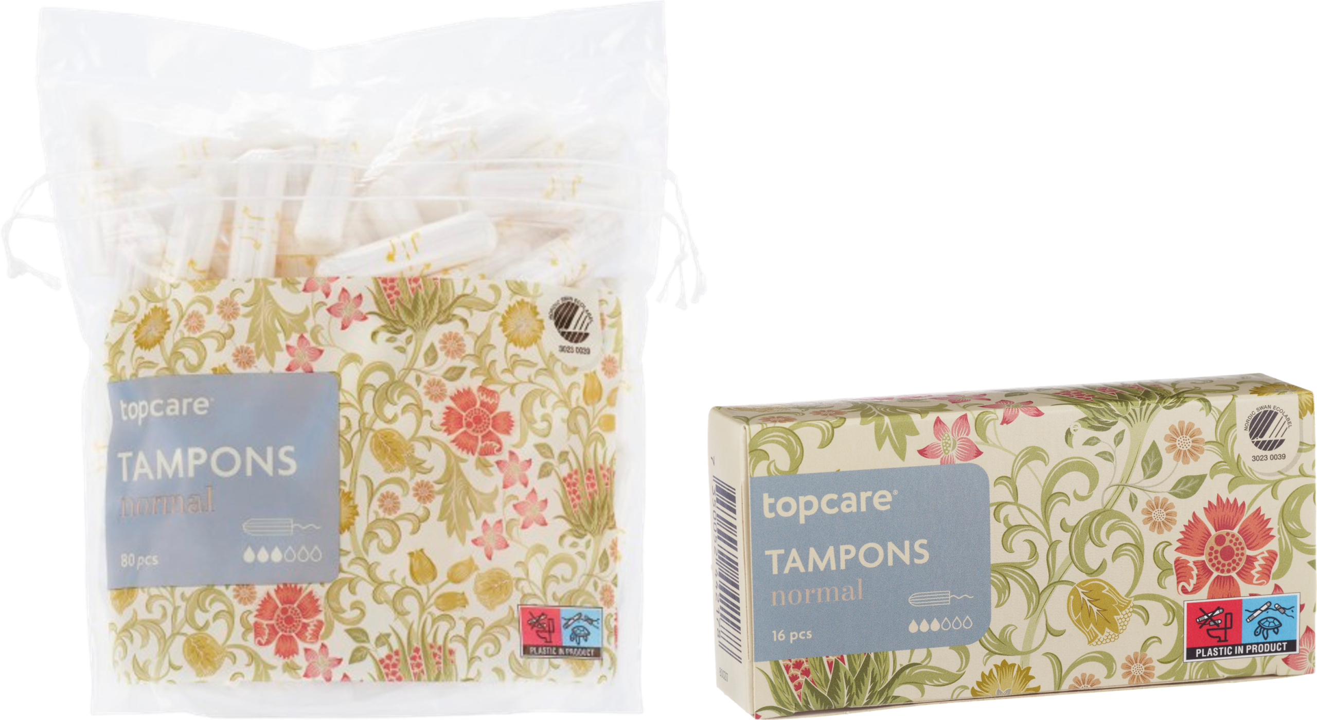 Topcare Tampons normal har medel absorption och rekommenderas för de flesta dagar under mensen. Den erbjuder en balanserad kombination av komfort och skydd och finns i förpackningar med 16 eller 80 stycken.