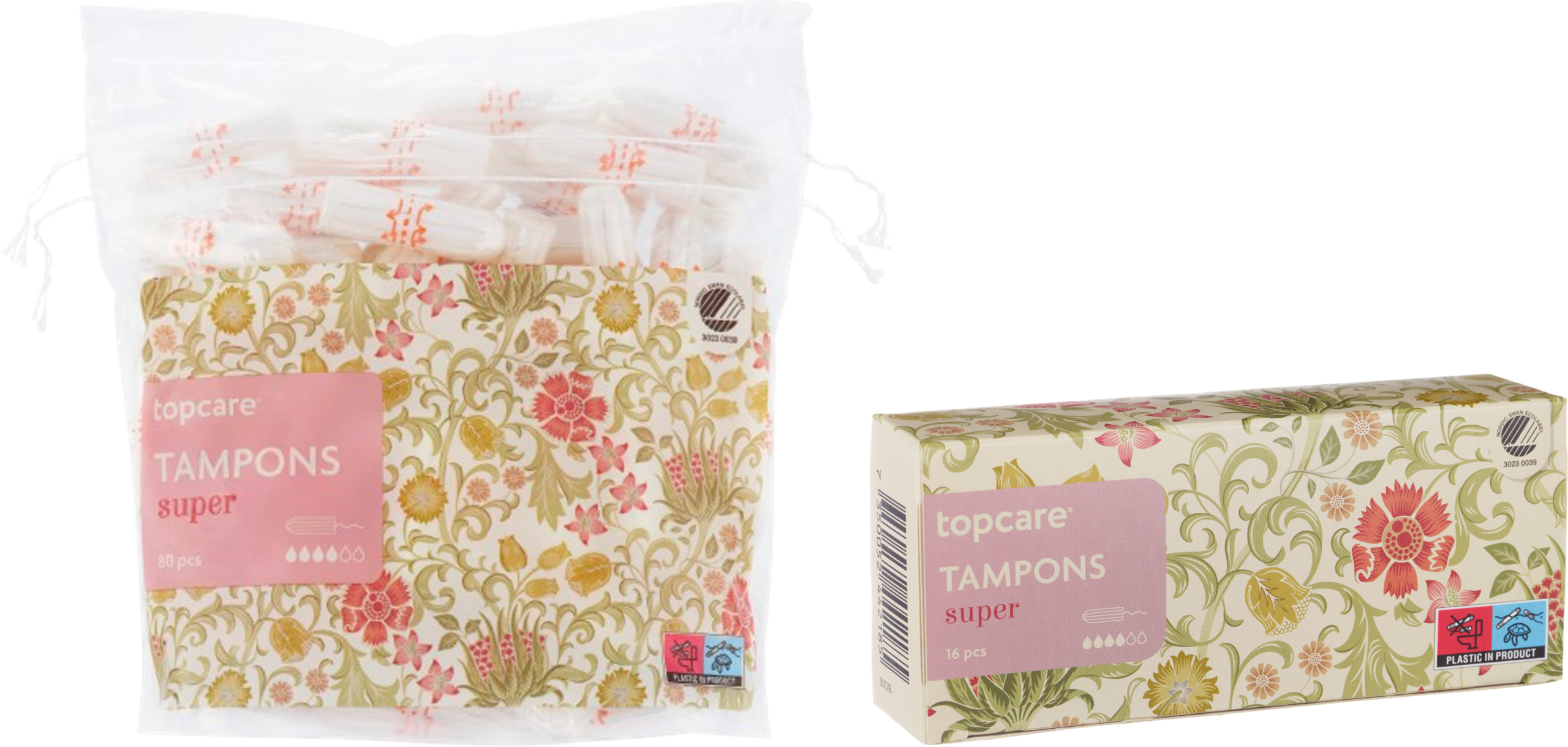 Topcare Tampons super har hög absorption och rekommenderas för dagar med stort flöde eller under nattetid. Den finns i förpackningar med 16 eller 80 stycken.